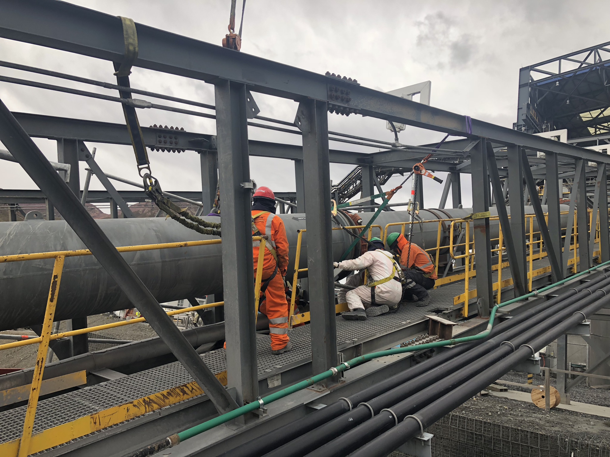 Soporte con personal para cambios de fajas transportadoras, polines, raspadores primarios, secundarios y terciarios, biplow, linatex laterales de arrastre.
